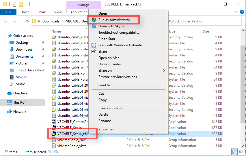 3. לחצו על עכבר ימני על הקובץ VBCABLE_SETUP_x64 ובחרו "הפעל כמנהל מערכת" (Run as Administrator).